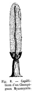 Il n’est pas rare de trouver à la surface du tan des masses gélatineuses, semblables à du jaune d’œuf vivement coloré. Appelée vulgairement tannée fleurie ou fleur du tan (Fuligo septica), cette masse est un Champignon de structure très simple puisqu’il n’est composé que de protoplasma vivant et mobile à la façon des Amibes, c’est-à-dire de ces animaux Protozoaire dégradés qui, eux aussi, n’accusent leur animalité à première vue que par les mouvements rampants, amiboïdes, de leur corps. Là semble donc être le sommet de l’angle aigu où le règne animal et le règne végétal se rejoignent. Cependant les Myxomycètes, auxquels appartient la tannée fleurie et dont on a fait un ordre de Champignons, ne produisent pas d’œufs, mais se multiplient par des spores immobiles et des zoospores et d’une façon plus compliquée que la simplicité de leur thalle ne l’aurait fait supposer. La tannée fleurie, telle que nous la voyons briller à la surface du tan, ne tarde pas à se [13] ramasser en boule mamelonnée. À l’intérieur de cette boule se forme un réseau d’une ténuité extrême, le capillitium (fig. 8), entre les mailles polyédriques duquel prennent naissance un grand nombre de spores. La membrane qui enveloppe ce sporange se brise à la maturité sous l’influence de la dessiccation et laisse échapper la multitude des spores. Immobiles, ces spores germent et épanchent leur contenu sous forme d’une traînée protoplasmique qui, elle, accuse déjà des mouvements amiboïdes. Elle s’effile à une extrémité et, finalement, se trouve pourvue à un de ses pôles d’un cil mobile, qui vibre et caractérise la zoospore la plus simple connue. |