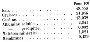 Au- dessous de la membrane coquillière se trouve le blanc ou albumen. L’albumen est composé principalement d’une substance azotée, très répandue dans les corps organiques: l’albumine, substance nutritive par excellence. Elle s’y trouve associée à de l’eau, des matières grasses et du sucre. La composition de l’albumine varie naturellement avec les progrès de la transpiration. Voici comment se répartissent les différentes substances de l’albumen sur 100 parties prises à un moment donné: |