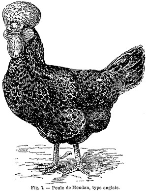 Chez la race de la Flèche, les éleveurs anglais ont employé tous leurs efforts à supprimer, au moyen de l’application constante de la méthode de la sélection, l’épi de plumes ou huppe rudimentaire qui couronne la tête des volailles de cette race et leur donne une apparence cruelle. |
