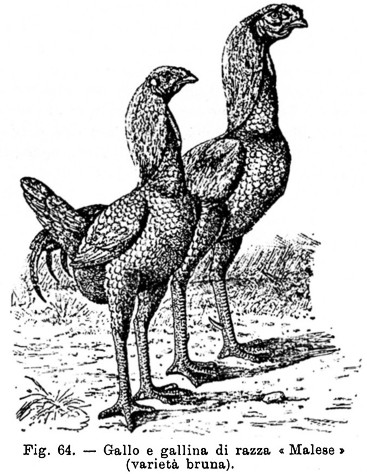 Ciò premesso, sorge subito la domanda: A quali di questi due tipi bisogna far risalire l’origine della moderna razza Cocincinese? Senza dubbio l’attuale gallina della Cocincina ha molta analogia col tipo introdotto in Europa nel 1847 dagli allevatori inglesi, mentre che si discosta di molto dai tipi posseduti tre anni prima dalla regina Vittoria: questi ultimi sono attualmente scomparsi, ma sino a pochi anni or sono erano ancora abbastanza diffusi, ed io li ricordo benissimo pochi anni dopo il 1860 a Napoli, ove erano allevati con molta predilezione sotto il nome di galline storze. L’influenza di questa gallina asiatica, come razza incrociante sulla nostra comune, ebbe talmente a manifestarsi nelle adiacenze di Napoli, che per qualche tempo i mercati furono inondati di galline storze italianizzate, le quali rappresentavano un tipo ben fissato. Ho accennato a suo tempo a questa sottorazza della nostra gallina italiana nel capitolo riguardante le varietà di quest’ultima, e l’ho chiamata semplicemente “gallina storza” come si usava a Napoli, confondendola colla gallina storza originaria (la Cocincinese a tarsi nudi).