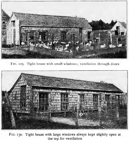 Ventilazione in case chiuse . Teoreticamente la ventilazione era fornita o solo da ventilatori o da ventilatori integrati, durante il bel tempo o durante le ore più calde del giorno, con adattamento accurato di porte e finestre; ma molte case erano costruite senza ventilatori, in base alla teoria che l'edificio conteneva abbastanza aria da provvedere i polli per molti giorni, se porte e finestre fossero chiuse così a lungo. Che i ventilatori di solito non ventilavano era dimostrato dal fatto che le case, quando chiuse, diventavano umide e l’umidità si condensava sul muro proprio frequentemente quando un metodo approvato di ventilare per mezzo di ventilatori era usato come quando nessun ventilatore era fornito. |