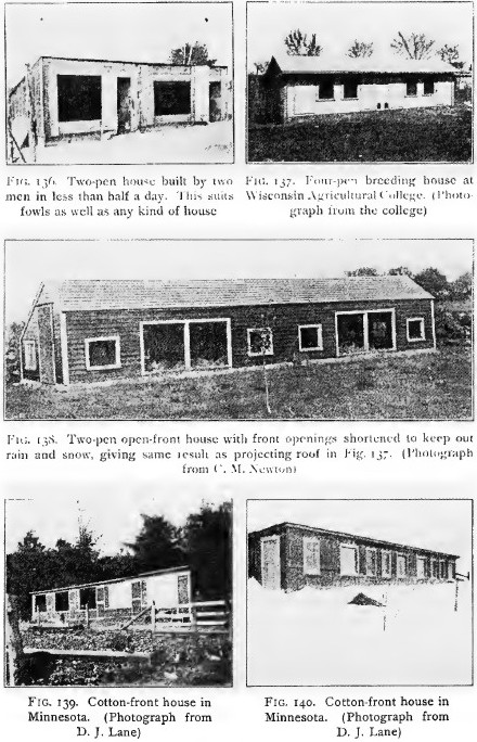 Houses with open fronts. In these, as is to be expected, considerable variety is found, but in general a house of this type belongs to one of two classes: Either it is an open house of such proportions, and with roosts so placed, that, theoretically, the fowls, when roosting, are kept warm, because they are so far from the open front and the rate of movement of air in the house is so slow that a considerable part of the heat they diffuse benefits them; or it is a cold house, in which the heat thrown off by the birds can have no appreciable effect on the temperature about them. In houses of the first class the air entering the front is supposed to make no draft to which the fowls on the roosts would be exposed; in houses of the second class drafts are disregarded. Those who advocate and use the warm open-front house have apparently not fully abandoned the idea that the fowls must be kept in a temperature sensibly higher than that outside, and must be protected from direct currents of air entering the house from without. Those who advocate and use cold houses hold that, within a limit (practically the degree of frost that the combs of the male birds will withstand), fowls may be accustomed to low temperatures; that it is not the absolute degree of cold that injures them or stops egg production, but the variations of temperature; and that fowls accustomed to the lowest temperatures and free supplies of fresh air are least affected by these. |