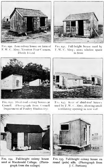 The idea that fowls must be kept warm was a fundamental principle in the management of fowls in scratching-shed houses and in the numerous adaptations of the plan made in houses of other types. The birds were to be kept warm by constant exercise in the litter in which their grain was fed on the floor of the scratching shed, or scratching room (as the case might be), while at night they kept warm in the close roosting room, or the reduced form of it called the roosting closet, or roost box, built with a hinged front or burlap curtain to retain the heat when the fowls were on the roost. It was commonly observed that fowls were likely to be more thrifty and free from disease in these houses when the keeper neglected to take precautions to keep them warm at night. Again, when [114] curtains of cotton cloth and burlap exposed to the weather were rotted out, it was not uncommon to delay renewing them, and no bad effects seemed to follow. Such things, and numerous instances remembered or observed of flocks of fowls doing well through cold winters in mere shells of houses, gradually broke down in many minds the notion that fowls must have warm houses, until, in the early years of this century, progressive poultry keepers began to realize that many of the despised makeshifts and flimsy structures of more primitive times, and of shiftless poultry keepers of their own times, were essentially better than their best structures designed according to principles upon which they had been working. |