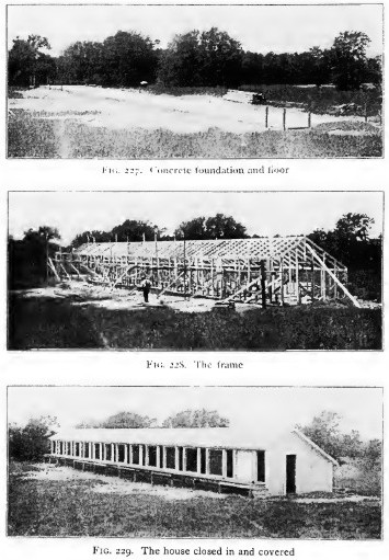 Durability has to be considered most in connection with materials which are shorter-lived than wood, and with parts that receive wear. When roofing paper is used for covering, it is economical to use paper of good quality that with proper care may be expected to last from fifteen to twenty years. Cloth is now often preferred to glass for openings, because it is cheaper and admits some air; but cloth or like porous material is so short-lived, when exposed to the weather, that in the long run it may be cheaper to use glass and leave windows partly open, as we do in our dwellings. If cement floors are used they should be substantially built; a common mistake is to make them too thin and with an insufficient foundation. Such floors crack and settle and become uneven and very unsatisfactory, and the faults cannot be remedied except by taking off the old cement and remaking the floor. |