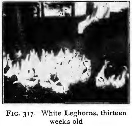 In the artificial rearing of poultry larger numbers of young birds are placed together from the first. The primary object is to [273] economize the cost of equipment and labor by making the groups as large as possible. In a properly heated and ventilated brooder the number of young birds may be much larger than in the natural group, but must still be small compared with the seeming capacity of the compartment. Common experience has taught the necessity of keeping young poultry of all kinds in comparatively small groups, wholly or partly separated, either by partitions or fences or by distance. This is the general practice in the communities where poultry growing is most flourishing. |
