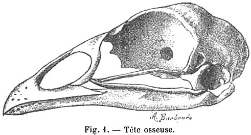 Les mâchoires sont plus ou moins revêtues d’une production cornée qui constitue le bec. De forme variable, même [11] d’une race à l’autre, celui-ci n’offre des différences très nettes dans sa constitution que si l’on compare les gallinacés et colombins aux palmipèdes, tout au moins pour les oiseaux qui nos occupent. Chez les premiers il est, en effet, toujours pointu et la valve supérieure repose sur l’inférieure. Chez les seconds, au contraire, elle la recouvre complètement et toutes deux sont revêtues d’une peau molle et plissée formant une série de lamelles transversales. |