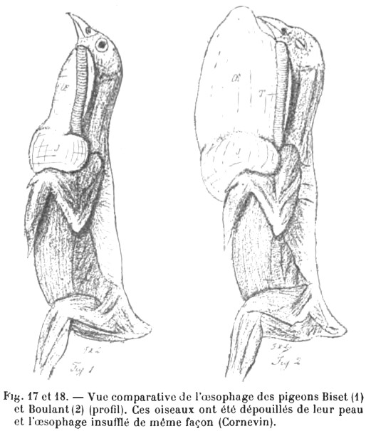 Aptitudes spéciales diverses. – Parmi nos oiseaux domestiques, quelques-uns sont recherchés pour leur aptitude au combat, au chant, à l’orientation et au vol soutenu. Tous les coqs peuvent se battre, tous chantent, tous les pigeons roucoulent et tous possèdent le sens de l’orientation, mais il en est qui se distinguent nettement des autres par une aptitude réelle à chacun de ces points de vue. |