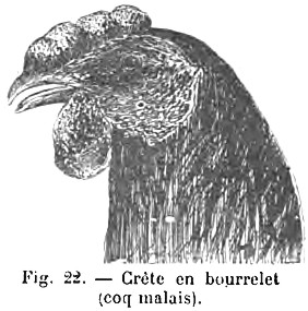 Il n’y a pas de signes extérieurs certains de la stérilité chez les oiseaux. On considère cependant comme des indices d’une faculté reproductrice restreinte, chez le coq, une crête pliée ou pendante, son moindre développement d’un côté, des barbillons et des éperons très inégaux, une queue portée de côté, [76] ou trop droite et revenant sur le dos dans son premier tiers (queue d’écureuil), enfin quelques parties du plumage analogues à celui de la poule. |