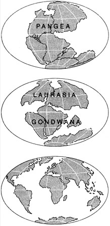 La Pangea fu ipotizzata da Wegener (1915) con la Teoria della deriva dei continenti, che si può così sintetizzare: ultimata la sua formazione nel Carbonifero, la Pangea cominciò a smembrarsi nel tardo Paleozoico o all’inizio del Mesozoico, dando così origine agli attuali continenti. La Pangea iniziò il suo smembramento in senso parallelo nel Triassico superiore - Laurasia a nord e Gondwana a sud - per l'aprirsi dell'Oceano Tetide. La suddivisione in senso meridiano, che nel corso del Mesozoico-Cenozoico porterà all'assetto attuale dei continenti, inizia invece intorno al Giurassico medio con l'apertura dell'Oceano Atlantico.