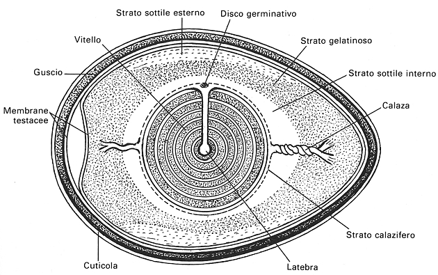 Fig. IX. 5 - L’uovo: disegno schematico che mette bene in evidenza la cuticola, il guscio e le membrane testacee.