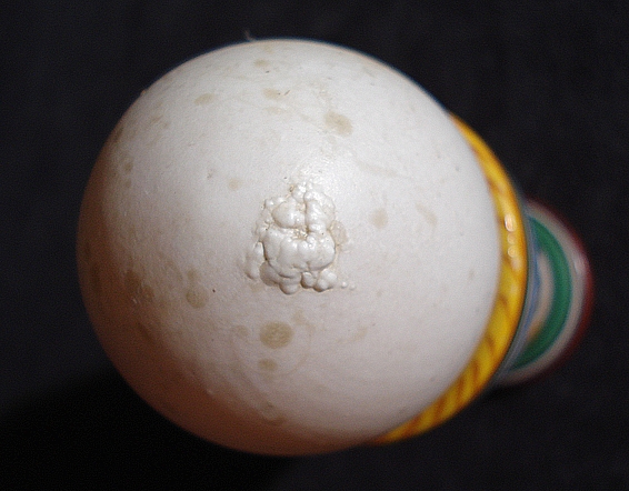 § Guscio propriamente detto: nel pollo ha uno spessore medio di circa 350 mm e contiene carbonato di calcio sotto forma di calcite, che ne rappresenta il 98%; il rimanente 2% è costituito da proteine; il guscio propriamente detto può essere ulteriormente suddiviso in due parti: