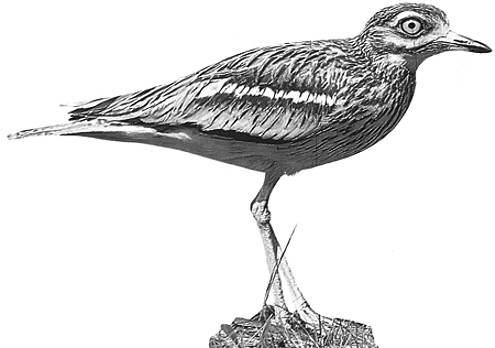 Fig. IX. 15 – Burhinus oedicnemus: questa foto del nostro Occhione - diffuso in Europa, Asia occidentale e Nordafrica - a scopo documentativo è di gran lunga preferibile a quelle molto meno belle che ho reperito dei suoi cugini americani Burhinus bistriatus e Burhinus superciliaris, ai quali somiglia moltissimo.