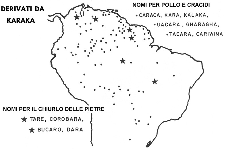 I nomi dati ai Cracidi - afferma Whitley - furono trasferiti anche al pollo quando gli Europei lo portarono nel Nuovo Mondo. Infatti esistono parecchie variazioni del nome dato ai Cracidi e al pollo che si basano su Karaca o Caraca, variazioni che chiaramente sono correlate a nomi attribuiti al Chiurlo delle pietre, come Corobara e Bucaro. Molti di tali nomi sono presenti nel Sudamerica nordorientale fra le tribù dei Caribi e degli Arawak, anche se si suppone che i derivati di Karaka in origine appartenessero agli Arawak.