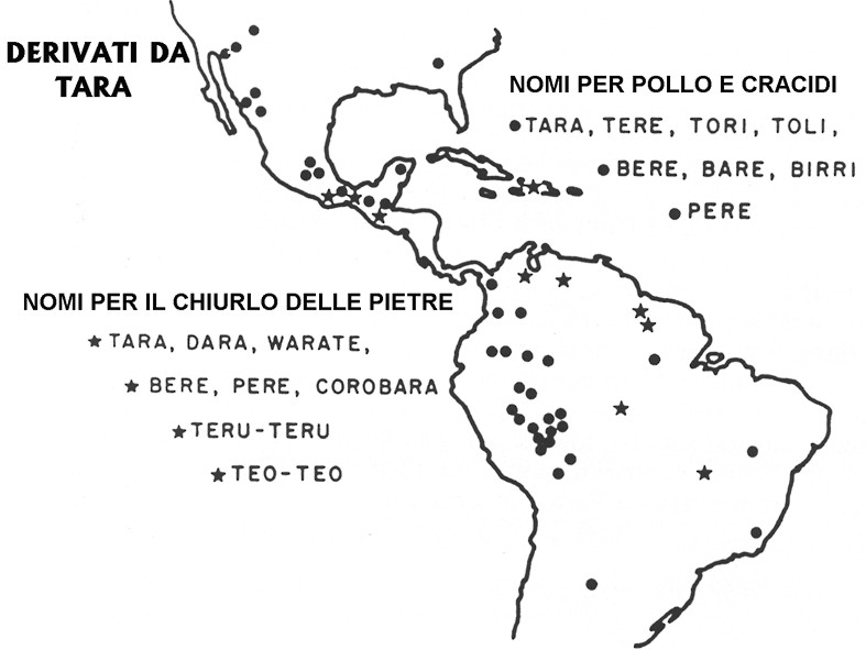 Tra i nomi americani riservati al Chiurlo, Tare, Taratana, Teru-teru e Teo-teo sono tutti tra loro correlati. Anche Taratana (Messico) e Tare (Columbia) sono ovviamente tra loro legati. Se questa affermazione è corretta, allora Tori e Totori del Messico occidentale sarebbero verosimilmente collegabili con i brasiliani Batari e Patari. I termini collegati con Tara sono concentrati in Messico occidentale e nelle Ande settentrionali.