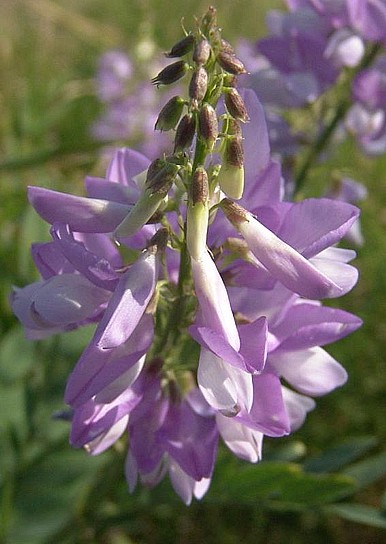 La Galega officinalis è un'erbacea perenne detta capraggine - dal latino tardo caprago-ginis, da capra, perché gradita alle capre - ma anche chiamata galega e avanese. Ha fusto eretto, striato, alto da 50 a 100 cm, foglie composte imparipennate con 5-8 paia di foglioline e fiori azzurrastri raccolti in racemi ascellari. Il frutto è un legume. Cresce nei luoghi erbosi e umidi e lungo i corsi d'acqua dal mare al piano submontano di tutta l'Italia continentale, ma più raramente al sud, ed è coltivata come foraggio e talvolta come erba ornamentale. Fiorisce in maggio e giugno e le sommità fiorite contengono un alcaloide, la galegina, che esplica un'azione ipoglicemizzante e galattogoga. Se non bastasse, secondo Pier de' Crescenzi i suoi semi sarebbero in grado di stimolare in modo meraviglioso la produzione di uova da parte delle galline: Gralega dicitur impinguare terram si viridis vertatur in eam. Itidem dicitur quod eius semen mirabiliter facit ovare gallinas. (pag. 216 di Ruralium commodorum libri XII, 1548)