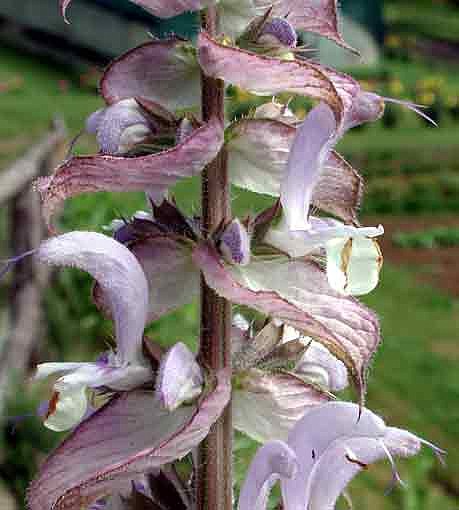 The Common Garden Clary is a biennial plant, its square, brownish stems growing 2 to 3 feet high, hairy and with few branches. The leaves are arranged in pairs, almost stalkless, and are almost as large as the hand, oblong and heart-shaped, wrinkled, irregularly toothed at the margins and covered with velvety hairs. The flowers are in a long, loose, terminal spike, on which they are set in whorls. The lipped corollas, similar to the Garden Sage, but smaller, are of a pale blue or white. The flowers are interspersed with large coloured, membraneous bracts, longer than the spiny calyx. Both corollas and bracts are generally variegated with pale purple and yellowish-white. The seeds are blackish brown, 'contained in long toothed husks,' as an old writer describes the calyx. The whole plant possesses a very strong, aromatic scent, somewhat resembling that of Tolu, while the taste is also aromatic, warm and slightly bitter.