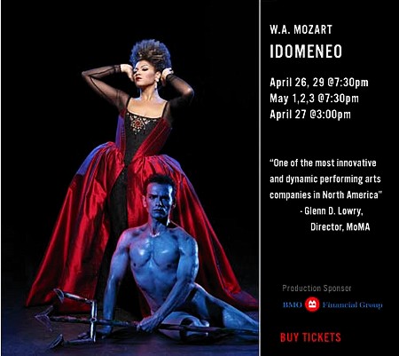 Outside the temple, the king and High Priest join with Neptune's priests in prayer that the god may be appeased. Arbace brings news that Idamante has killed the monster. As Idomeneo fears new reprisals from Neptune, Idamante enters in sacrificial robes, saying he understands his father's torment and is ready to die. After an agonizing farewell, Idomeneo is about to sacrifice his son when Ilia intervenes, offering her own life instead. The Voice of Neptune is heard. Idomeneo must yield the throne to Ilia and Idamante. Everyone is relieved except Electra, who longs for her own death. Idomeneo presents Idamante and his bride as the new rulers. The people call upon the god of love and marriage to bless the royal pair and bring peace.