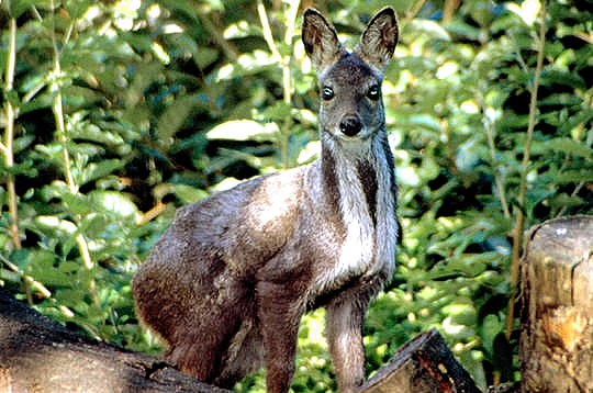 The overall colouration of animals varies from a light yellowish brown to almost black, although a dark brown is most common. The head is generally lighter. A pair of whitish stripes extends from the chin down the chest to the belly, while a scattering of lighter spots may be present on the back and sides. Young are born intensely spotted on their upper body, with adult colouration reached gradually by 1.5 years of age. The hind legs are much longer and more powerful than the front legs, which causes the back to slope, and is an adaptation to saltatorial (jumping) locomotion. The hindquarters, which are highly arched, may be 5-10 cm / 2-4 inches higher than the shoulders. This feature is further emphasized by the small chest and thin neck which is carried low. The head is elongated and small relative to the body. The features of the face, however, are oversized. The eyes are large and the ears are long and rounded, with have a wide range of mobility. Antlers are not present in this species, however, the sharp upper canines of adult males grow very long (up to 10 cm / 4 inches) and project well below the chin in older individuals (the canines of females are not visible).The tail is very small and is often hidden in the fur on the rump. The lateral hooves (dewclaws) are well developed in this species, and are usually seen in the footprints of standing animals.