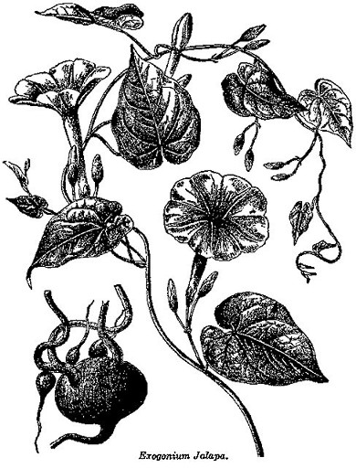 I tuberi della Gialappa messicana, Exogonium purga o Ipomoea purga. Convolvulacea del Messico e delle Ande, coltivata in tutta l'America Centro-Meridionale (San Felipe Jalapa de Díaz è una città messicana, ma Jalapa è anche una città del Guatemala). I tuberi contengono vari principi attivi resinosi di struttura glucosidica, tra cui la convolvulina, e costituiscono una droga (chiamata anch'essa gialappa) usata un tempo come purgante drastico contro la stipsi ostinata, come coadiuvante degli antielmintici e come decongestionante nell'ipertensione e negli edemi generalizzati.