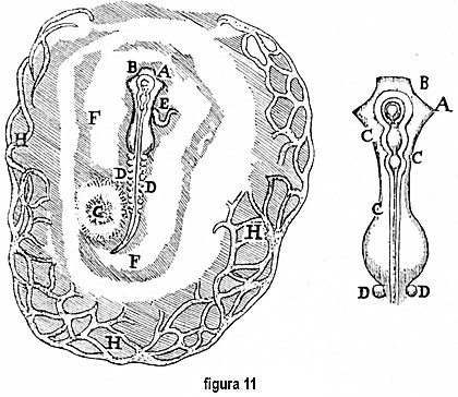 [11] Probabilmente, allo stadio della stria primitiva. Il raggiungimento di questo stadio anteriormente all'incubazione è sottolineato dagli autori posteriori, alcuni dei quali hanno invocato a spiegazione il forte calore estivo poco sopra ricordato dal Malpighi. (Luigi Belloni, 1967)