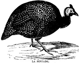 Les Grecs et les Romains connaissent ces oiseaux, dont ils avaient essayé la domestication. Varron les désigne sous le nom de poules d’Afrique. Toutefois, les pintades étaient alors fort rares, et elles ne tardèrent pas à disparaître; aussi n’en fait-on aucune mention au moyen âge. Ce n’est qu’au XVe siècle que les Portugais rapportèrent ces oiseaux en Europe. |