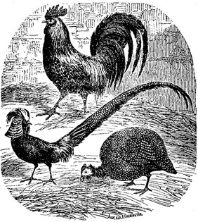Élevage. – Les pintadeaux sont fort délicats et très difficiles à élever dans nos pays froids et brumeux parce qu’ils sont originaires des climats brûlants de l’Afrique. Aussi la première et presque la seule précaution à prendre pour leur élevage consiste à les garantir du froid et surtout de l’humidité pendant les deux premiers mois qui suivent leur naissance. Dans toute cette période, les pintadeaux [296] doivent séjourner dans l’intérieur de la ferme. C’est à peine si l’on peut les laisser sortir pendant les heures les plus chaudes de la journée, mais sans les perdre de vue, pour pouvoir les faire rentrer à la moindre menace d’orage ou de pluie. |