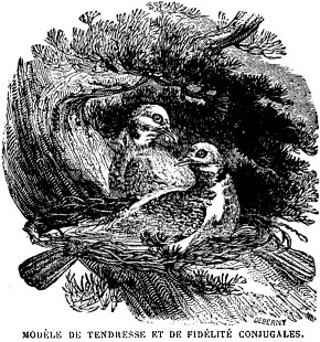 «C’est que le pigeon est une vivante incarnation de cette tendresse; son existence est une idylle que n’interrompt pas la saison rigoureuse, qui persiste au milieu de frimas, lorsque les affres du froid et de la faim paralysent les ardeurs de toute créature…. Le pigeon est à peu près seul à apprécier tous les raffinements de l’art d’aimer; par la constance avec laquelle il en savoure les prémisses, il s’élève presque à la hauteur d’un sentiment. Un couple de pigeons, par ses rapprochements de becs, par ses enlacements de cols, traduit toute la passion avec toutes les délicatesses de la chasteté. |