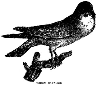 8° Les pigeons cavaliers, et dans le nombre le cavalier faraud, très fécond et de couleur blanche ordinairement. Ils enflent leur gorge comme les précédents, mais ils s’en distinguent par l’épaisseur des narines{;}<.> |