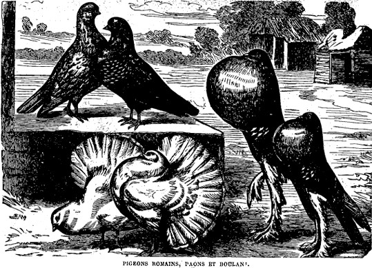 11° Les pigeons romains. Œil bordé de rouge, deux fèves forment la membrane tuberculée qui sert d’opercule aux narines; race féconde, commune en Italie et comprenant plusieurs variétés très jolies{;}<.> |