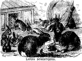 «À l’état sauvage, dit M. Rendu, le lapin, une fois hors de son terrier, n’interrompt son repas que pour vaguer et flâner. Très courtes, mais très multipliées sont ses promenades; dès qu’il s’arrête, il se met à ménager; au moindre bruit, il détale. Le lapin domestique, privé de sa liberté, procède un peu différemment. Manger est toujours sa grande affaire, mais, au lieu de précipiter sa digestion par l’exercice, il la confie au sommeil. À peine est-il repu, il s’allonge, se couche à plat ventre, étend ses pattes de devant, y pose son museau, et s’endort d’un sommeil léger. À son réveil, il fait nonchalamment quelque pas, se dirige vers la table derechef, et puis, de nouveau, s’endort: ainsi s’écoule, sans souci, son heureuse existence que remplit surtout l’idée de bien vivre. Gardons-nous de déranger ses goûts de sybarite, réglons-les plutôt, afin de les tourner à notre profit.» |