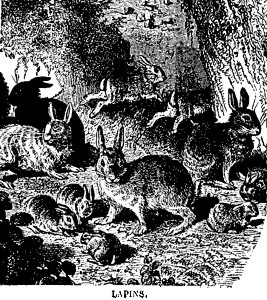 «Allo stato selvatico, dice il signor Rendu, il coniglio, una volta uscito dalla sua tana, interrompe il suo pasto solo per vagabondare e bighellonare. Le sue passeggiate sono molto brevi, ma assai numerose; nel momento in cui si ferma, si mette in guardia, al minimo rumore fila via. Il coniglio domestico, privato della sua libertà, si comporta un po’ diversamente. Mangiare è sempre la sua maggiore occupazione, ma, invece di affrettare la sua digestione col movimento, l’affida al sonno. Non appena è sazio, si distende, si corica a piatto sul ventre, distende le zampe anteriori, vi posa il suo muso e si addormenta di un sonno leggero. Al risveglio fa qualche passo con noncuranza, si dirige nuovamente verso la tavola, e poi si riaddormenta: così trascorre, senza preoccupazione, la sua felice esistenza che soddisfa sopratutto l’idea del vivere bene. Evitiamo di guastare i suoi piaceri di raffinatezze, regoliamoli piuttosto, al fine di volgerli a nostro vantaggio.» |