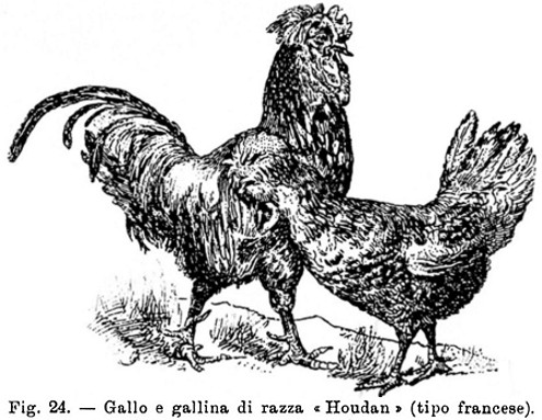 3) RAZZA HOUDAN – È indubitato che questa splendida razza deriva da incroci più o meno fortunati: molte sono le congetture che si fanno in proposito, così gli uni dicono che la Houdan è il risultato dell’unione della razza Padovana colla Dorking, altri invece opinano per la Crèvecoeur anziché per la Padovana. Comunque sia, non saprei dar torto al Voitellier che dichiara la razza Houdan la regina delle razze francesi, anzi altri autori francesi vanno più lontano, ammettendo addirittura che la razza Houdan sia stato il punto di partenza delle altre due razze consorelle, la Crèvecoeur e La Flèche: essi affermano che la Crèvecoeur sia direttamente risultata dalla Houdan e la razza La Flèche dalla Crèvecoeur mediante intromissione di sangue spagnuolo.