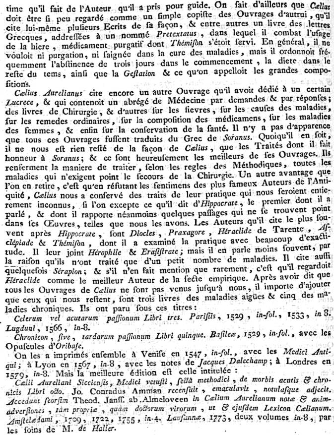We possess a translation by Aurelianus of two works of Soranus of Ephesus (2nd century), the chief of the "methodist" school of medicine, on chronic and acute maladies — Tardae or Chronicae Passiones, in five, and Celeres or Acutae Passiones in three books. The translation, which is especially valuable since the original has been lost, shows that Soranus possessed considerable practical skill in the diagnosis of ordinary and even of exceptional diseases. It is also important as containing numerous references to the methods of earlier medical authorities.