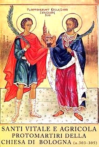 Martirologio Romano: A Bologna, santi Vitale e Agricola, martiri, dei quali, secondo quanto racconta sant’Ambrogio, il primo fu dapprima schiavo dell’altro, poi compagno di martirio: Vitale, infatti, patì tali tormenti da non esserci più parte del suo corpo senza ferita; Agricola, per nulla atterrito dal supplizio del suo schiavo, lo imitò nel martirio subendo la crocifissione.